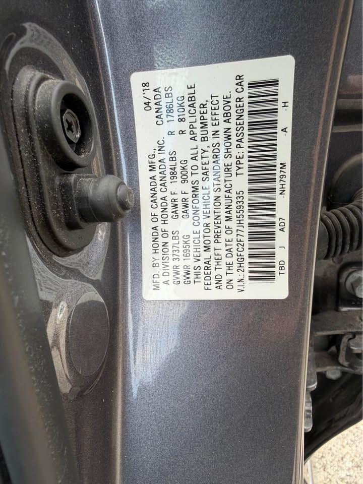 Driven 52,000 miles Automatic transmission Exterior color: Grey * Interior color: Black 5/5 overall NHTSA safety rating Fuel type: Gasoline 31.0 MPG city * 40.0 MPG highway * 34.0 MPG combined Seller's description 2018 Honda Civic 73KMiles Car like new Everything working great Inspection ok ?? Alloy wheels Original Title Hablo Espanol